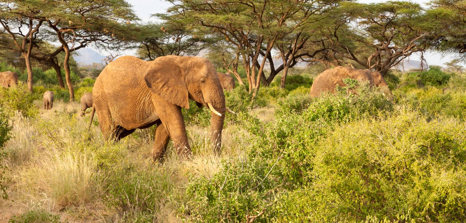 Foto: Kenia: Elefanten auf Safari – sie ziehen durch dichtes Buschland, umgeben von sattem Grün.