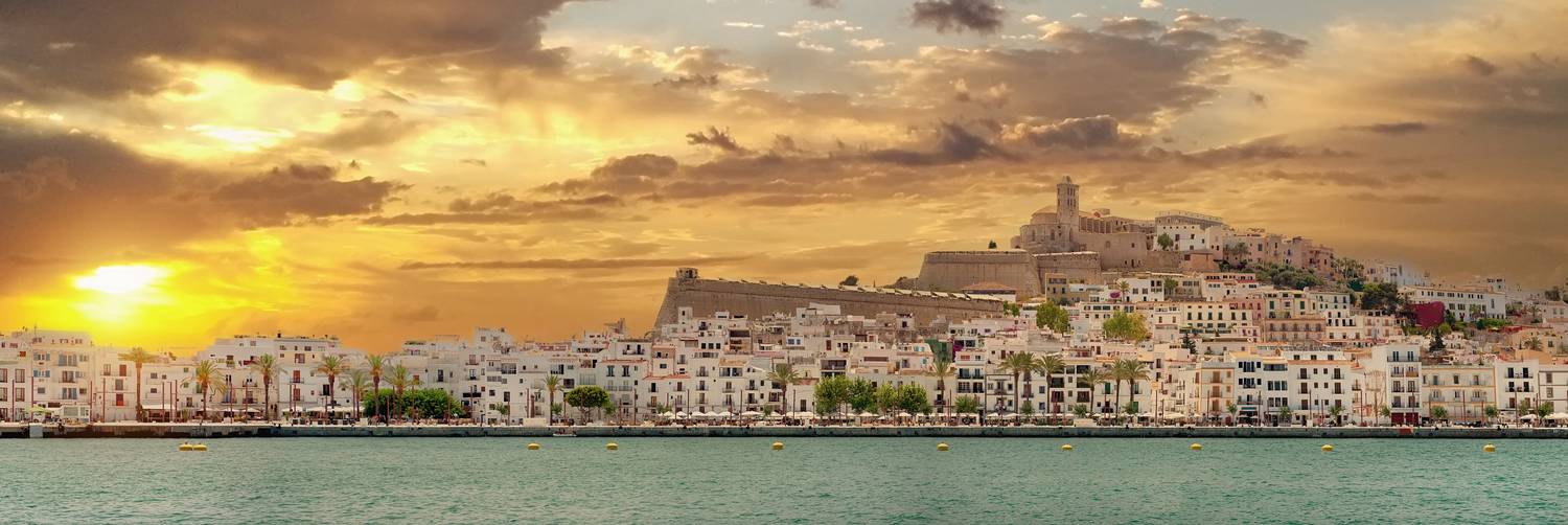 Foto: Panoramablick auf Dalt Vila, Ibiza – die historische Altstadt hoch über dem Meer, besonders magisch im Abendlicht.