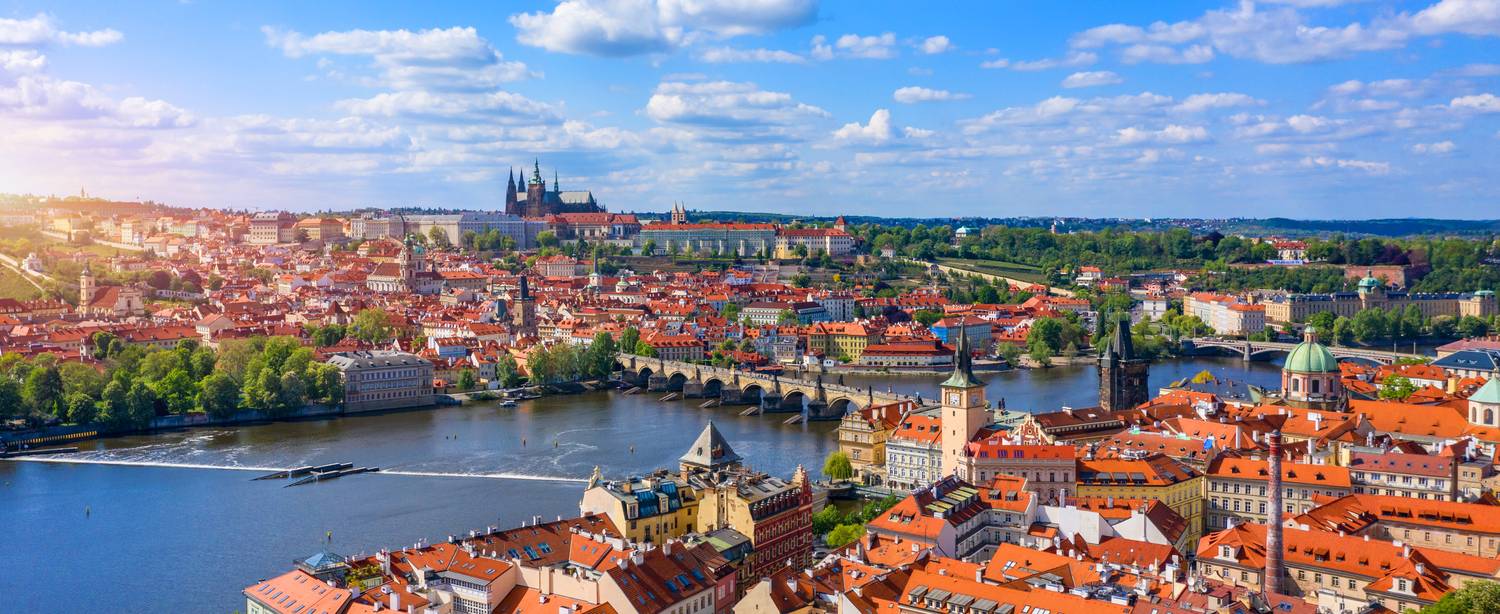 Foto: Prag von oben: Historische Dächer, Flusspier und Postkartenstimmung.