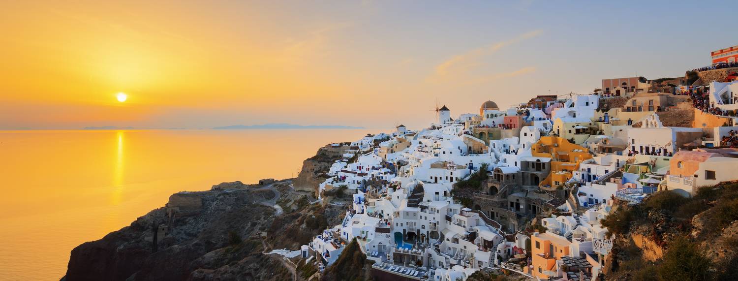 Foto: Panoramablick auf Oia bei Sonnenuntergang – Santorinis ikonische Kulisse aus weissen Häusern und goldenem Abendlicht.