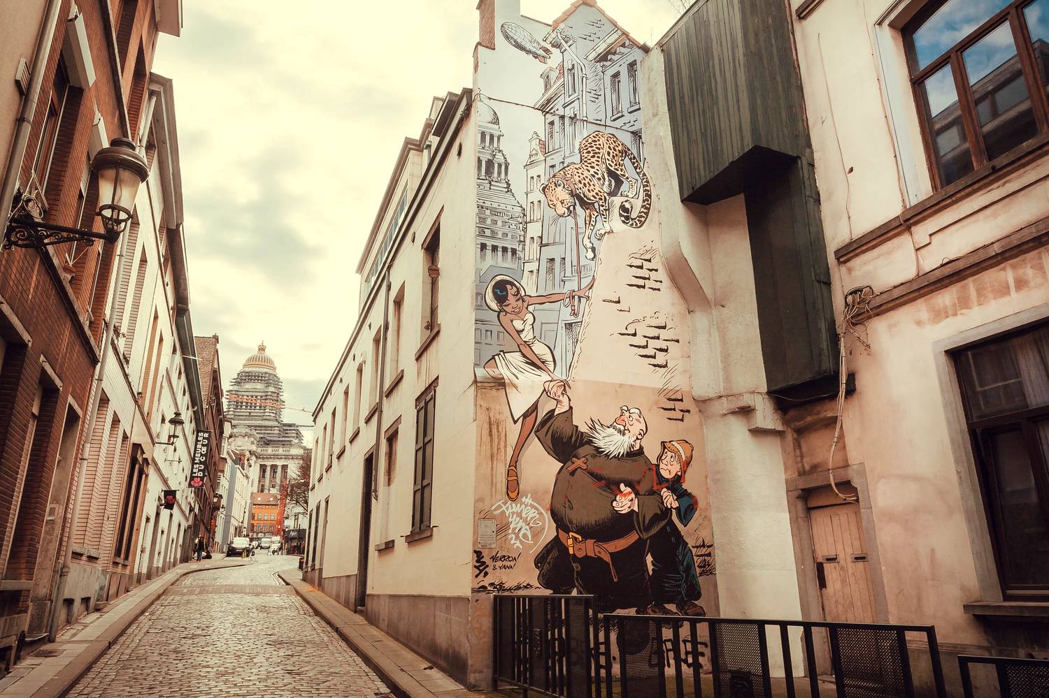 Foto: Altstadtgasse in Brüssel mit farbenfrohen Wandbildern im typischen Comicstil.