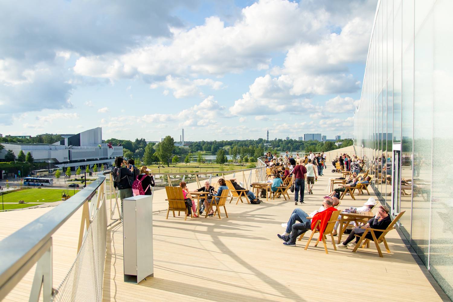 Foto: Sommerabend in Helsinki: Menschen geniessen die Abendsonne auf der Terrasse der Oodi-Bibliothek.