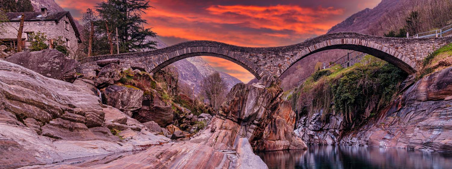 Foto: Valle Verzasca: Alte Steinbrücke und eindrucksvolle Felsformationen in der smaragdgrünen Flusslandschaft.