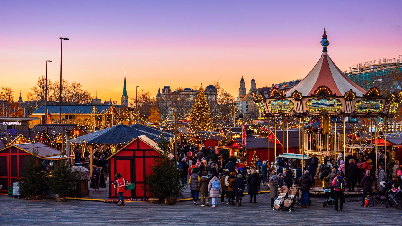 Foto: Neben dem beliebten Christkindlimarkt im Zürcher Hauptbahnhof findet man am Bellevue das Wienachtsdorf, ein moderner Markt mit Designständen, Streetfood und einer Eisbahn direkt am See.