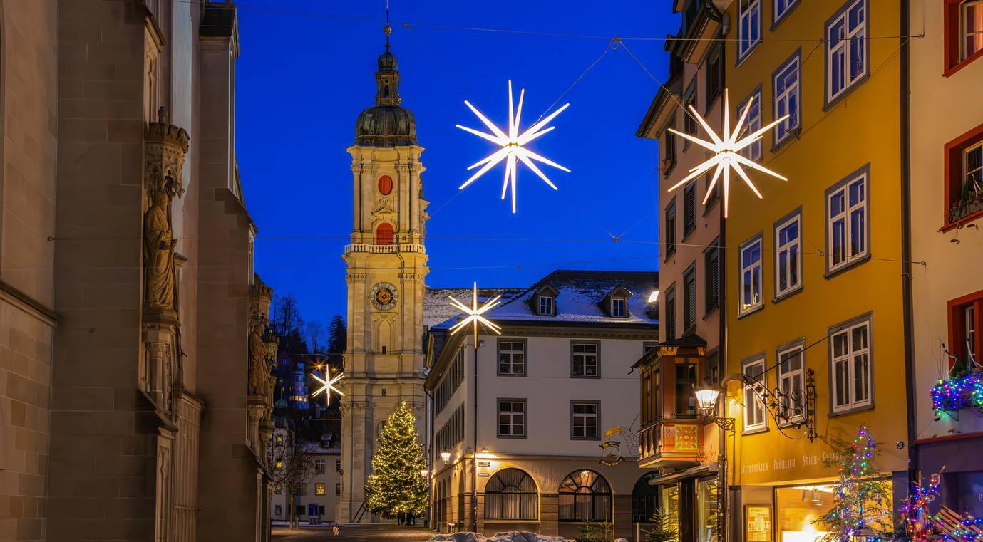 Foto: Wenn über 700 Sterne über St. Gallen erstrahlen, beginnt die wohl schönste Zeit des Jahres. Der Weihnachtsmarkt zieht sich durch die Altstadtgassen zwischen Stiftskirche und Marktplatz.