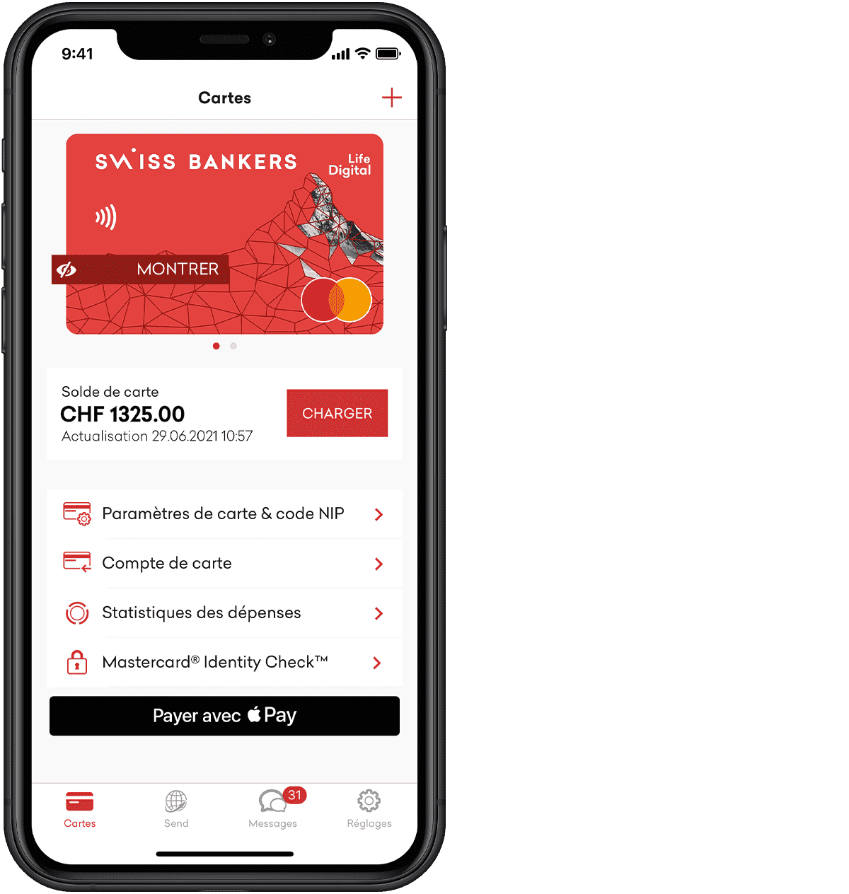 L’app Swiss Bankers offre des fonctions pratiques telles que la notification par messages push après chaque transaction, un aperçu du solde disponible et des dépenses, le chargement de la carte, le blocage immédiat en cas de perte, le remplacement de votre carte numérique ou physique dans l’application – et bien plus encore.